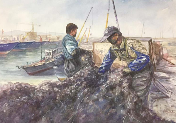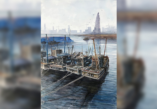 2020年2.28号入选青岛美协”众志成城抗击疫情”青岛美术家岛城美术作品展-水彩画《中国力量-火神山的建设》《复工的渔民》