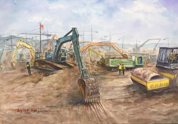 2020年2.12号入选青岛青年美术家主题创作展“文心战役,同舟共济”水彩画《最可爱的人》《中国力量-火神山的基础建设》
