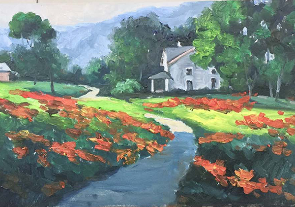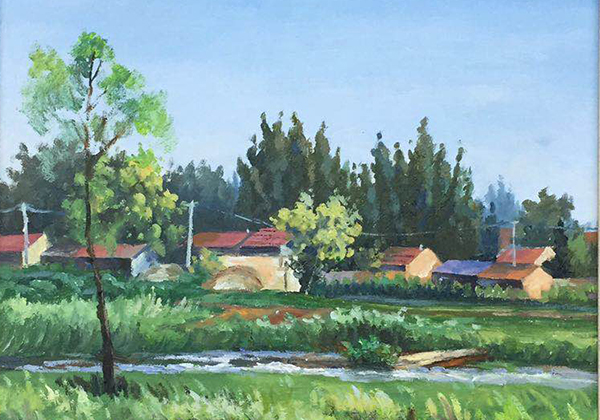2018年10.1号“不忘初心,唱响国歌”庆祝建国69周年书画精品展,油画《家乡美·宁静的村庄》在青岛书画艺术促进会展厅展出