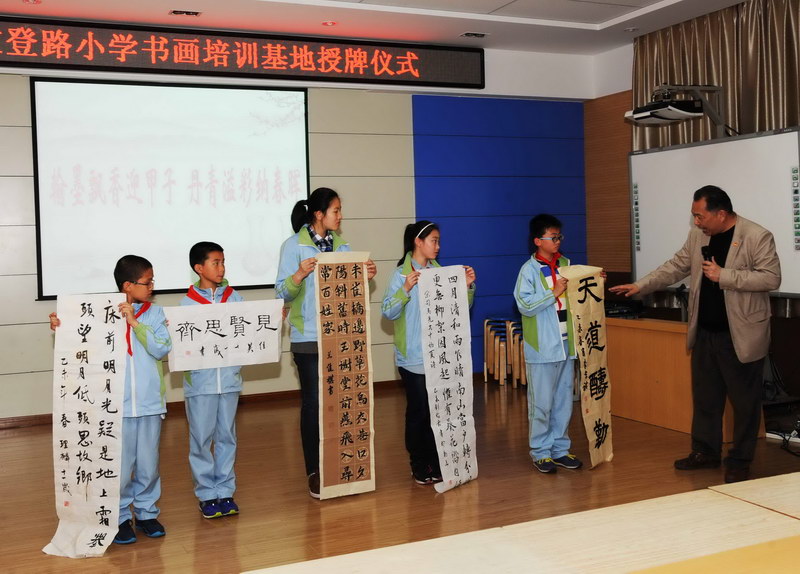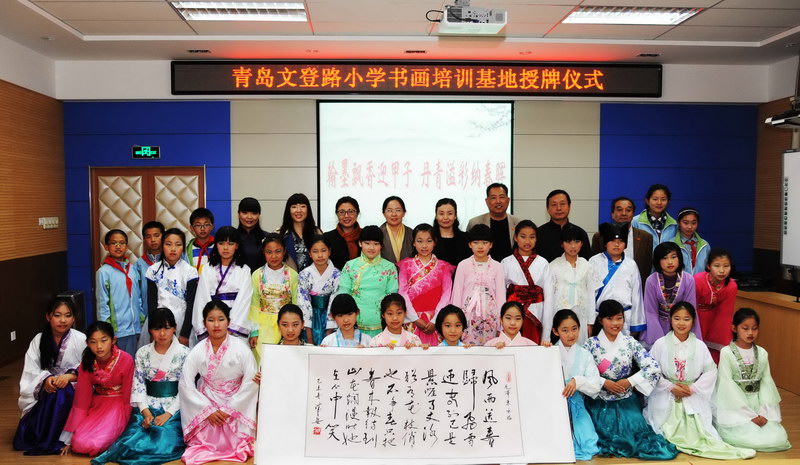 青岛市书画艺术促进会与文登路小学书画培训基地今日揭牌。