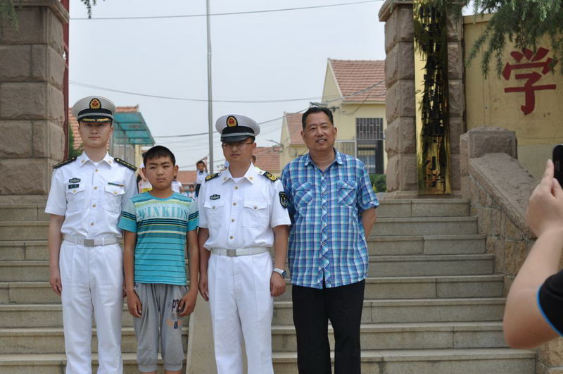 海军91033部队五中队政治指导员王鑫(左)、青岛市书画艺术促进会主席倪汉婴(右)与学雷锋先进个人林进超(中)及资助的贫困学生徐金旗合影。五年级徐金旗同学因父母车祸双亡,二级军士长林进超与其结对资助帮扶。